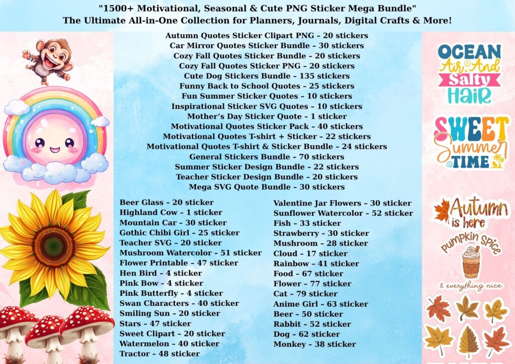 This 1,500+ Motivational & Clipart Sticker Mega Bundle has everything you need — quotes, animals, holidays, food & more!
